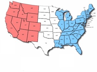 The map below illustrates the divisions of Western, Central, Eastern Continental USA